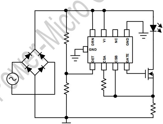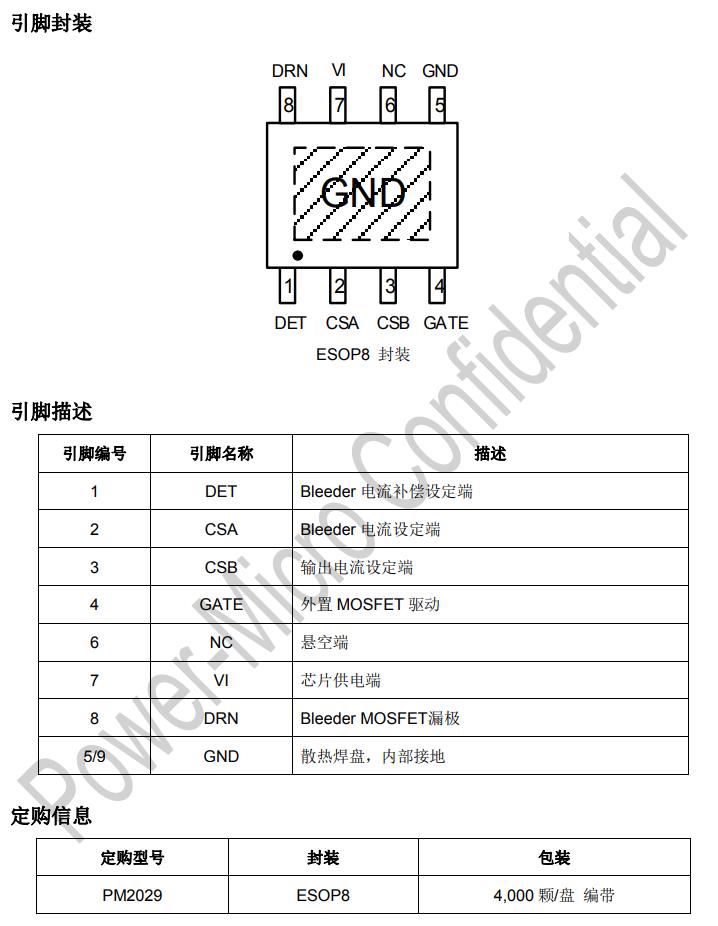 PM2029是一款大功率可控硅調(diào)光線性驅(qū)動芯片, 電源系統(tǒng)結(jié)構(gòu)簡單,只需很少的外圍元件就可以 實現(xiàn)非常優(yōu)秀的恒流特性。在實現(xiàn)精簡的外圍電 路、較小的驅(qū)動器體積的同時,大大降低了系統(tǒng) 成本。 PM2029內(nèi)部集成了兩個固定恒流源,一路控制 BLEEDER電流,一路驅(qū)動外置MOS,可滿足大 功率可控硅調(diào)光的照明應(yīng)用。 PM2029采用了500V的高壓半導(dǎo)體制造工藝以 確保市電瞬變時的可靠性;內(nèi)部集成了過溫度補 償電路以避免驅(qū)動器的熱失效。PM2029還集成 了各種保護(hù)功能,包括輸出開路、CS開路保護(hù)。 從而提高了LED恒流電源的可靠性。