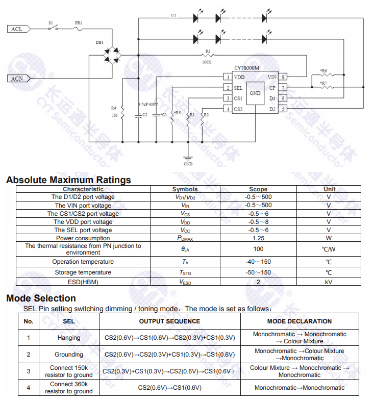 CYT8000M is a switching dimming / toning constant current LED chip. It's suitable for AC 180V-240V or-Ae 90V130V input voltage, constant precision<+5%. When the CYT8000M is used to dimming, the output current can be changed by turning on / off power supply, thus changing the brightness of LED. The dimming ratio can be set through external CS resistors.