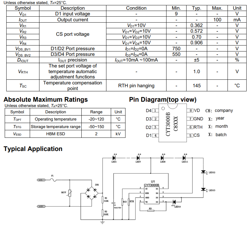 CYT3000B is a linear constant current IC on high voltage LED chips, used in LED lighting field. Throughr a unique patented technology and constant current control, IC CYT3000B can realize constant cur...