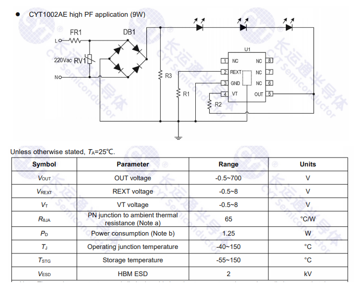 CYT1002AE is a single segment LED linear constantcurrent control chip with constant power and highpower factor. It integrates 700V high voltage MOSFET,with superior resistance to avalanche breakdown a...