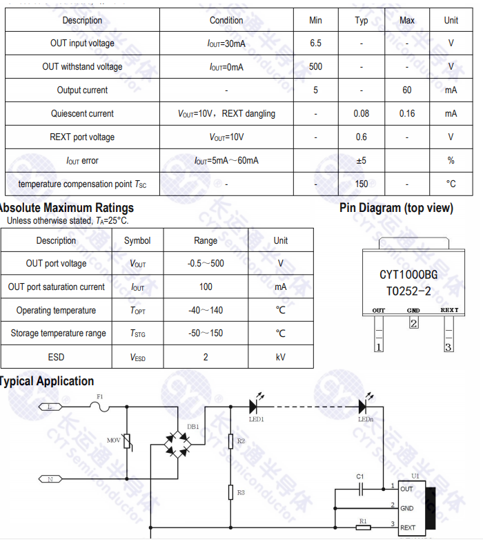 CYT1000BG is a Single Channel high voltage linear constant current LED driver, which integrates 700V high voltage MOS. The output current can be set through an external resistor between 5mA and 60mA.