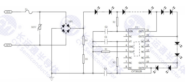 The CYT3012B is a five-segment low THD high power factor LED linearconstant current driver which integrates 700V high-voltage MOSFET. Thechip has excellent resistance to avalanche breakdown and surge. It canpass the 650V lightning surge test when there is no external protectiondevice. It has a built-in over-temperature protection function to improvesystem application reliability. The peripheral can adjust the output current byadjusting the REXT resistance value. At the same time, CYT3012Bintegrates the input line voltage compensation function. When the input linevoltage is too high, the CYT3012B will reduce the output current through anexternal compensation resistor to ensure that the input power does notchange with the line voltage.It is mainly applied in LED lighting, architectural lighting engineering andother fields. The cost is low with simple structure and fewer peripheralcomponents.
