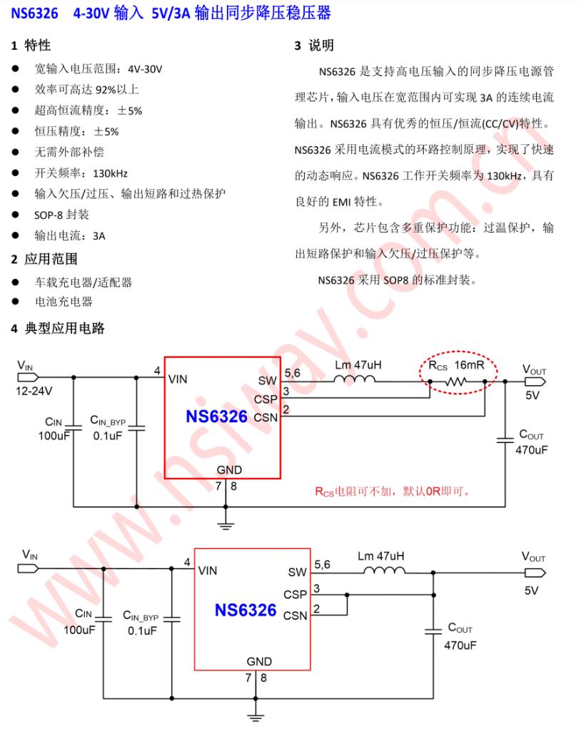 NS6326是支持高電壓輸入的同步降壓電源管 理芯片,輸入電壓在寬范圍內可實現3A的連續電流輸出。NS6326具有優秀的恒壓/恒流(CC/CV)特性。