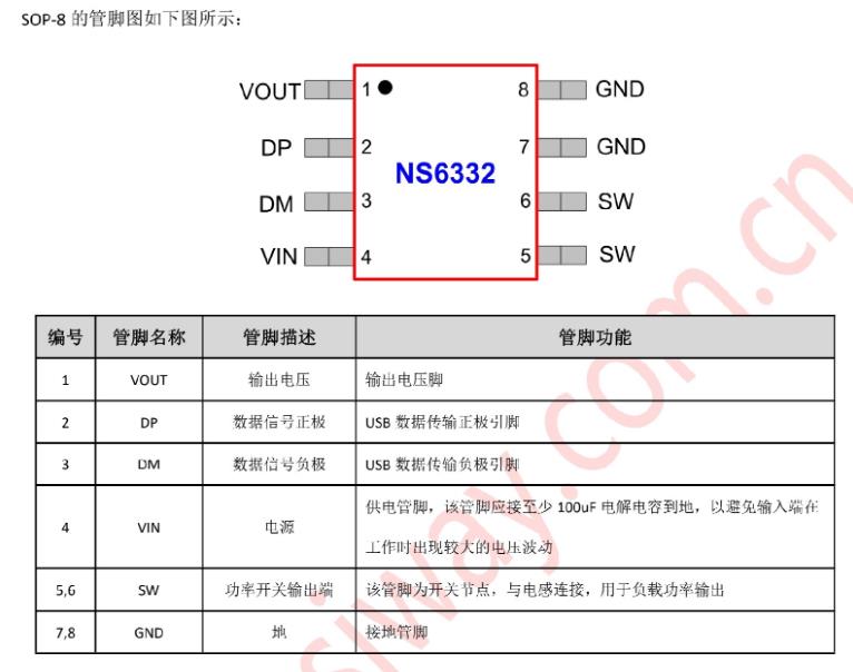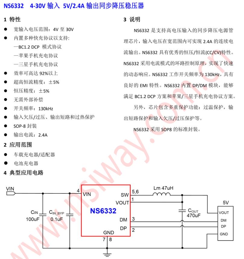 NS6332是支持高電壓輸入的同步降壓電源管理芯片,輸入電壓在寬范圍內可實現2.4A的連續電流輸出。NS6332具有優秀的恒壓/恒流(CC/CV)特性。NS6332采用電流模式的環路控制原理,實現了快速的動態響應。NS6332工作開關頻率為130kHz,具有良好的EMI特性。NS6332內置DP/DM模塊,能夠滿足BC1.2DCP方案和蘋果/三星手機充電協議方案。另外,芯片包含多重保護功能:過溫保護,輸出短路保護和輸入欠壓/過壓保護等。NS6332采用SOP8的標準封裝。