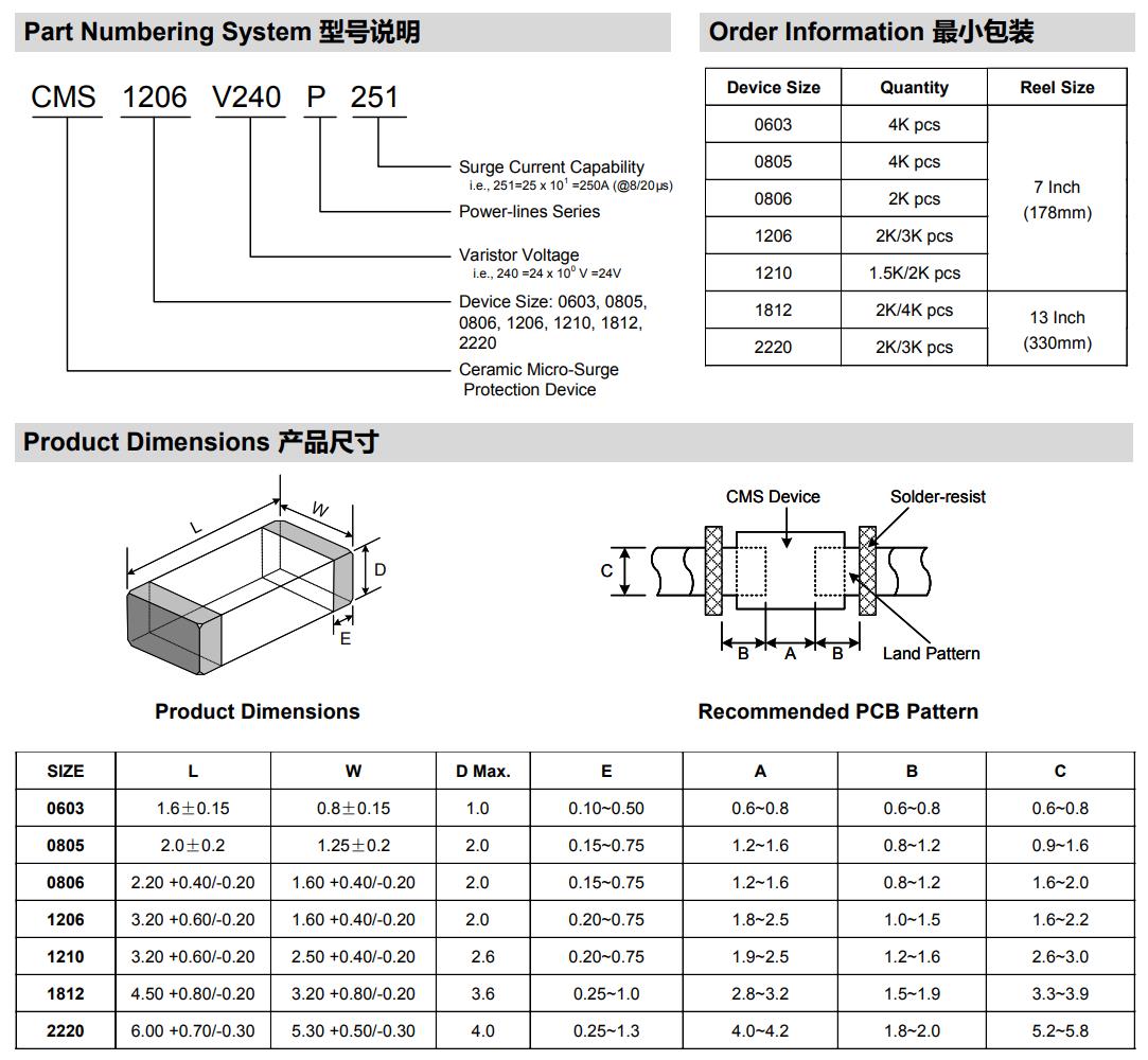 The Ceramic Micro-Surge Protection Device (CMS) is manufactured from semiconducting ceramics which offer  rugged protection and excellent transient energy absorption in a small SMD package. These devices are designed to  suppress a variety of transient events, including those speified in IEC61000-4-2, IEC61000-4-5 and other standards  used for Electromagnetic Compliance (EMC).