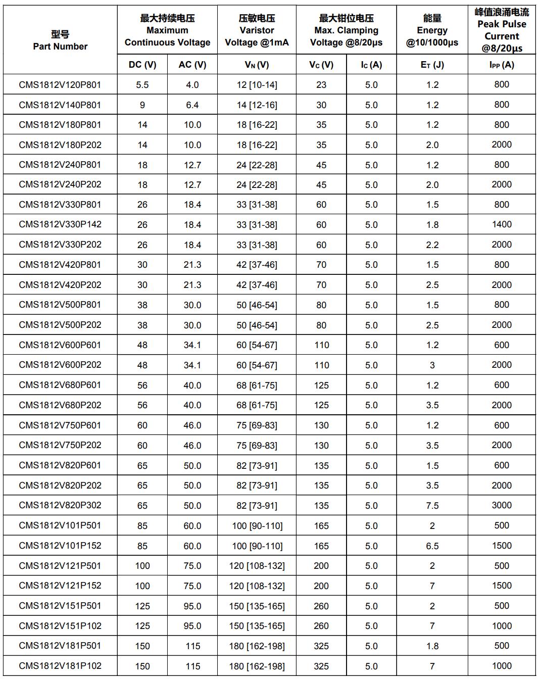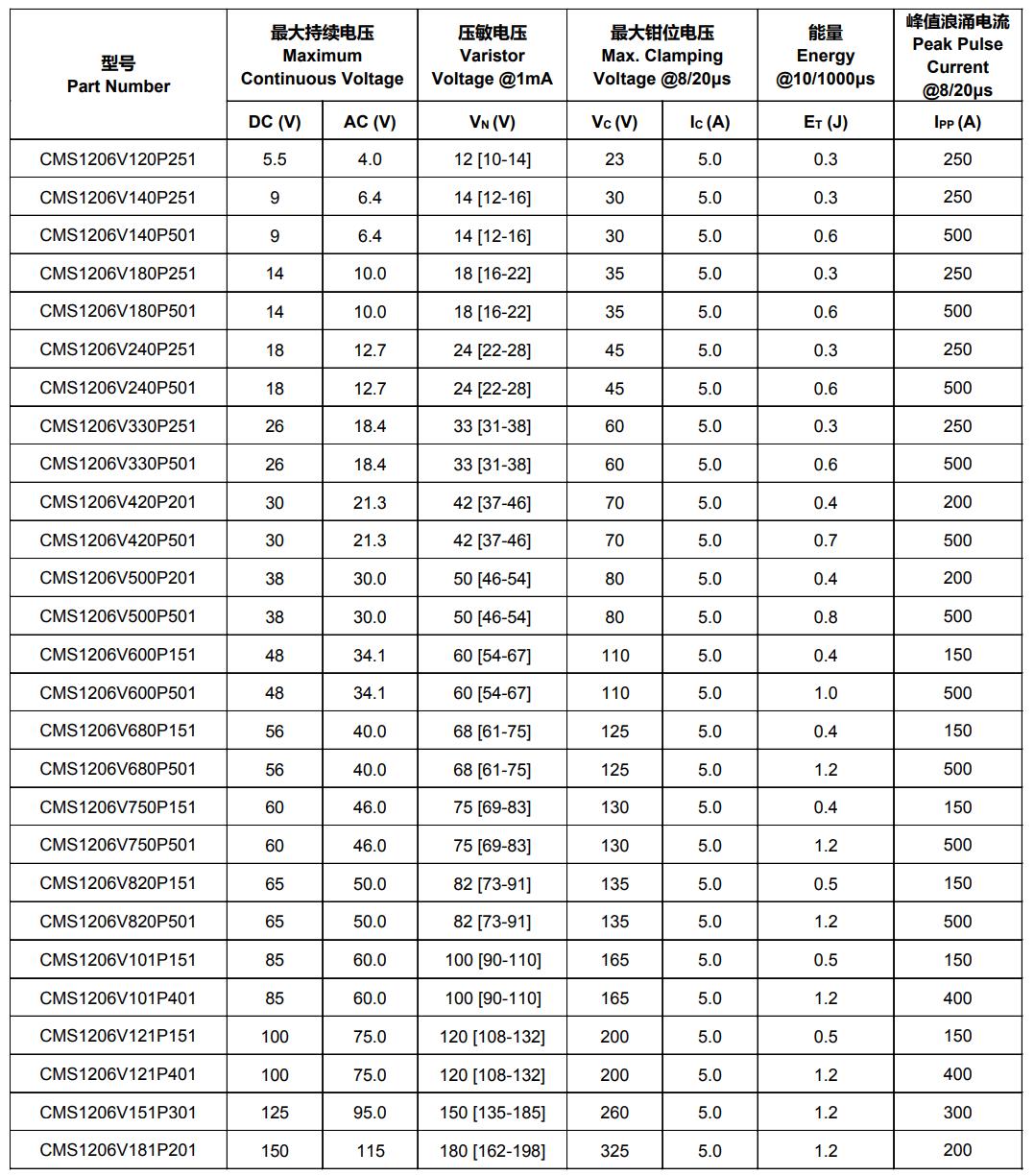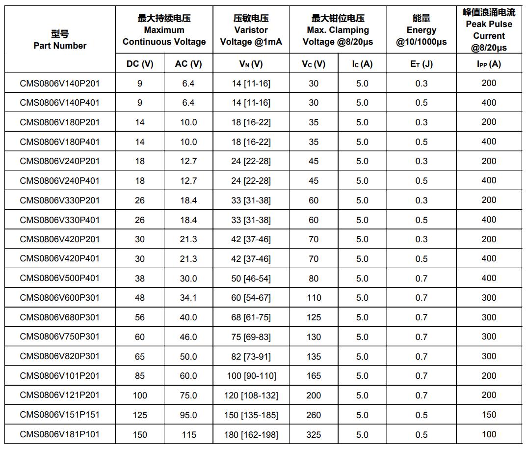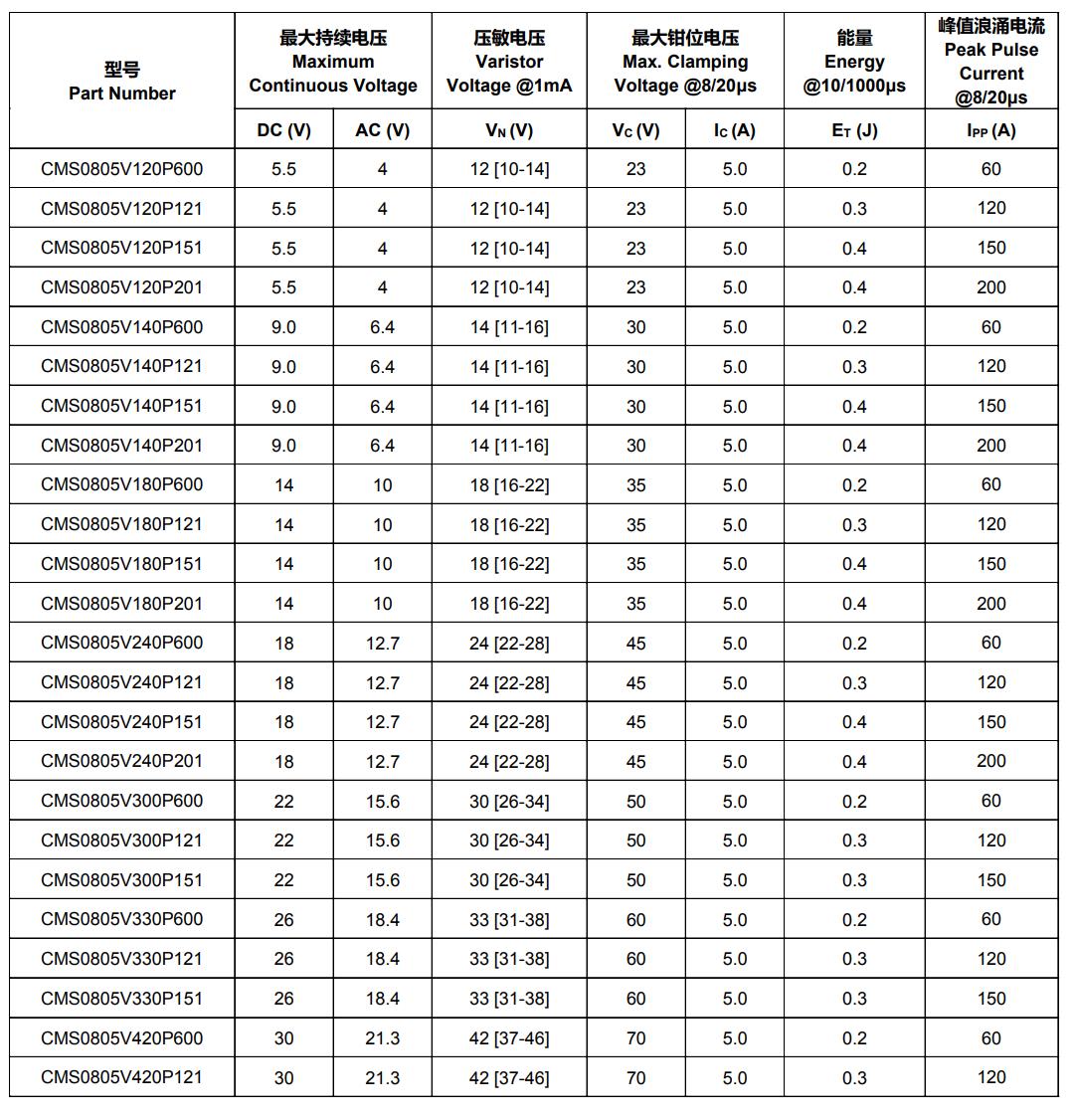 The CMS-P Series is specially designed for AC power-lines protection applications. It features a very high current  protection capability with a very small size, also a very fast response thus a ultra low clamping voltage. These  characteristics make CMS-P Series devices the best replacement of TVS and improvement of metal oxide (MOV) in  high working voltage applications.