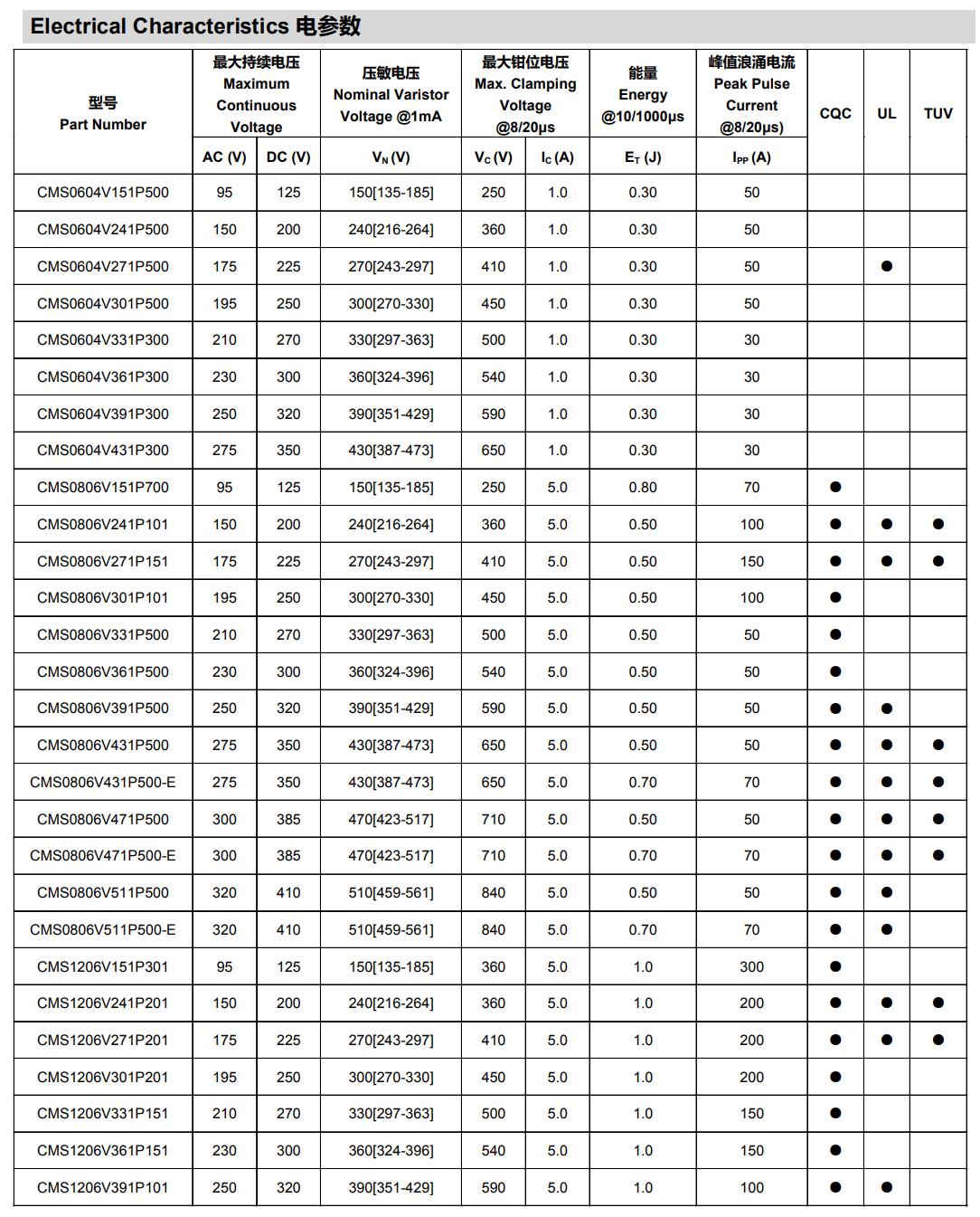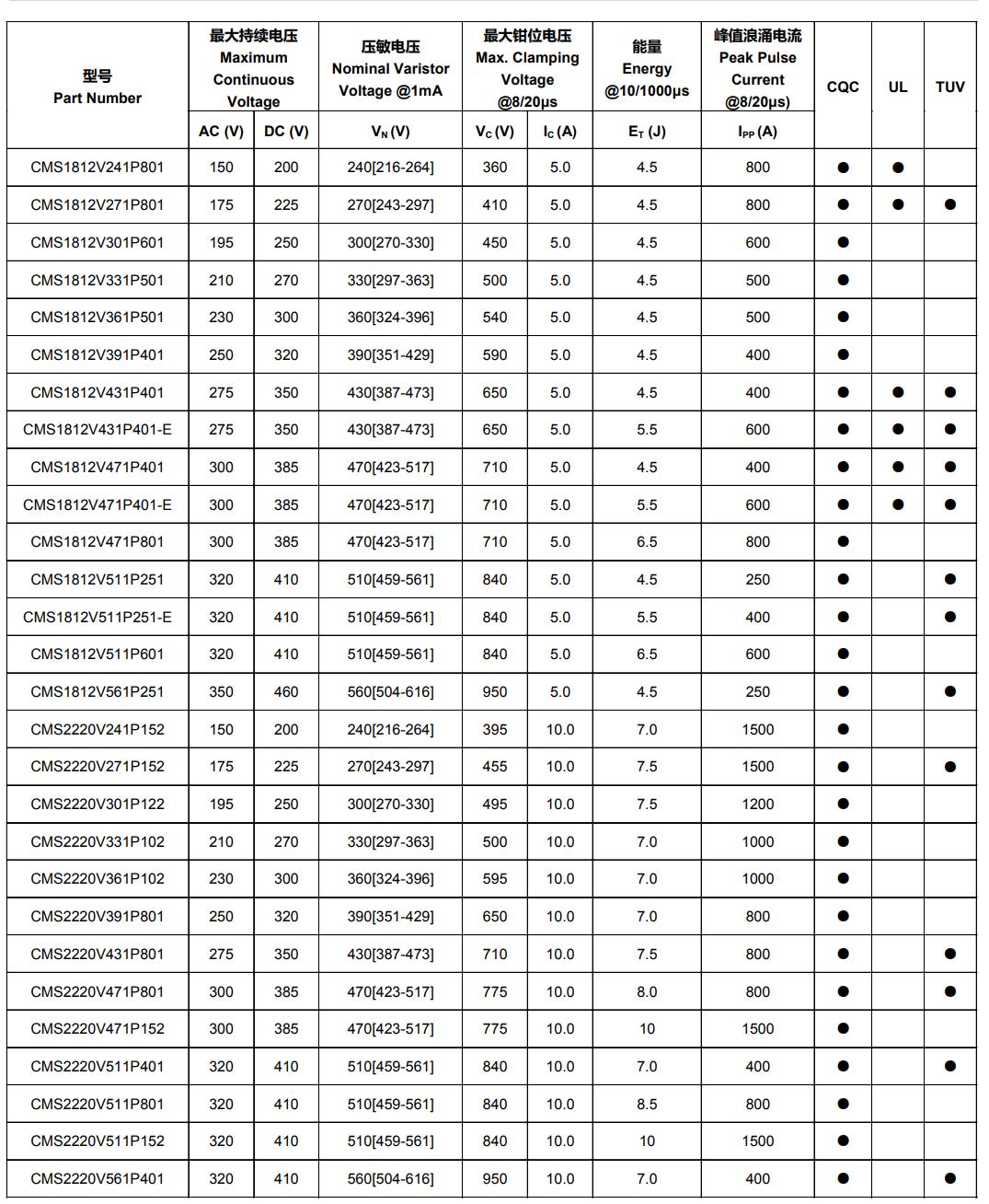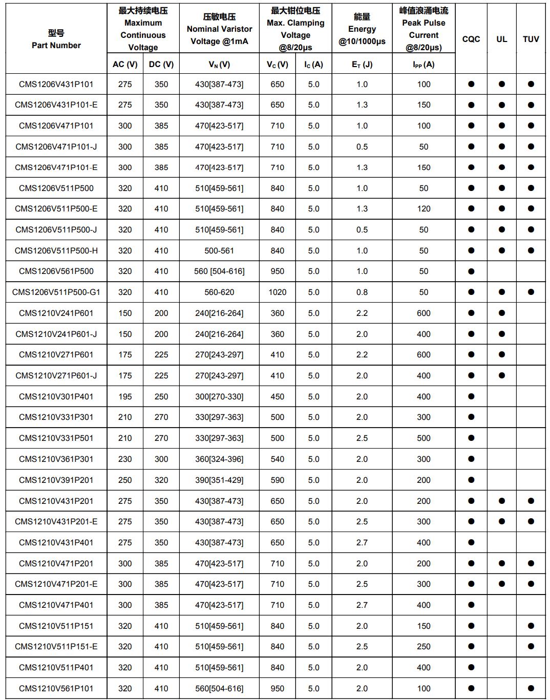 The CMS-P Series is specially designed for AC power-lines protection applications. It features a very high current  protection capability with a very small size, also a very fast response thus a ultra low clamping voltage. These  characteristics make CMS-P Series devices the best replacement of TVS and improvement of metal oxide (MOV) in  high working voltage applications.