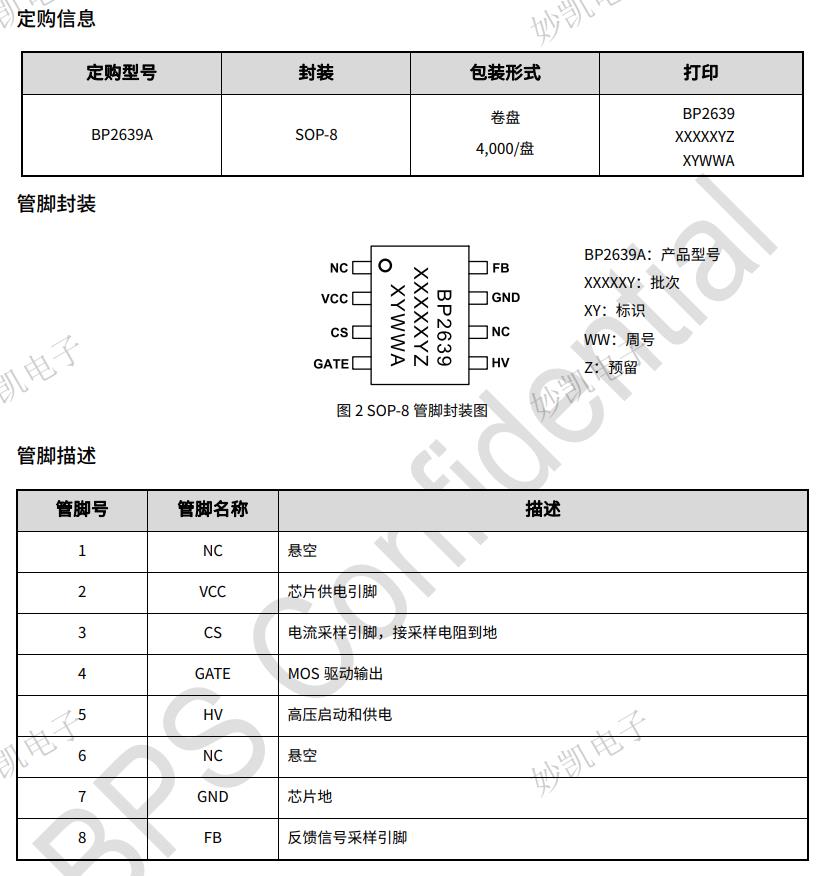 BP2639A具有多重保護功能,包括輸出過壓保護(OVP)、MOS過流保護、芯片溫度過熱保護等。BP2639A采用SOP-8封裝。