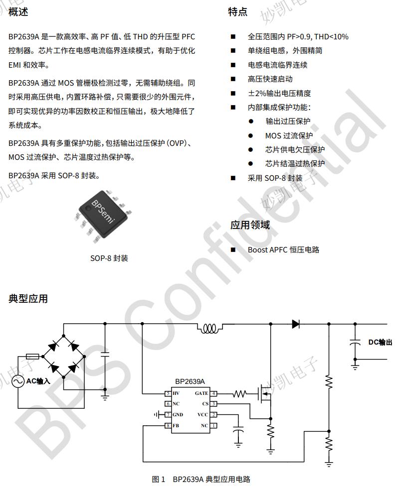 • BP2639A 是一款高效率,高PF值,低THD的升壓型 PFC控制器,PF>0.9.THD