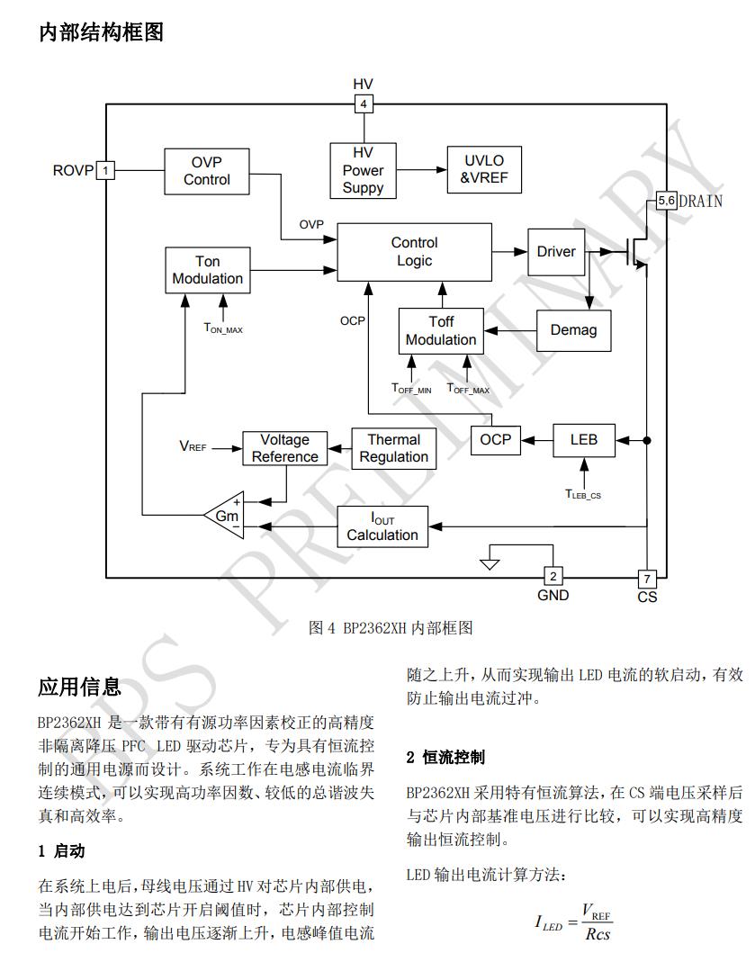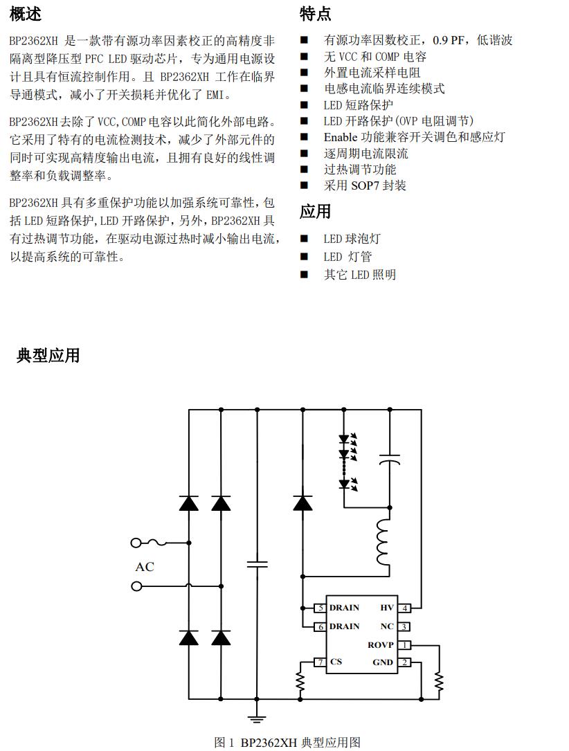 BP2362XH去除了VCC,COMP電容以此簡化外部電路。 它采用了特有的電流檢測技術(shù),減少了外部元件的 同時(shí)可實(shí)現(xiàn)高精度輸出電流,且擁有良好的線性調(diào) 整率和負(fù)載調(diào)整率。