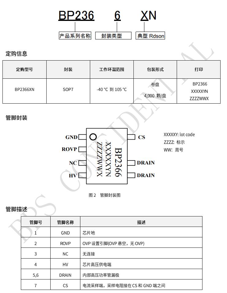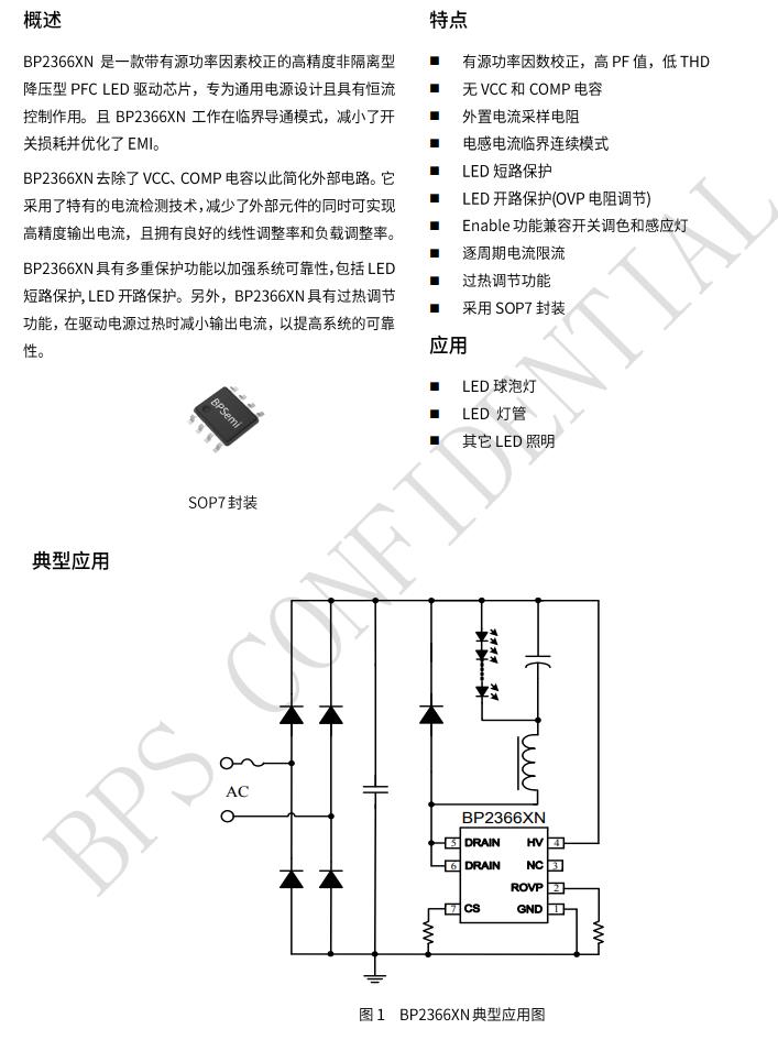 BP2366XN是一款帶有源功率因素校正的高精度非隔離型 降壓型PFCLED驅動芯片,專為通用電源設計且具有恒流控制作用。且BP2366XN工作在臨界導通模式,減小了開關損耗并優化了EMI。