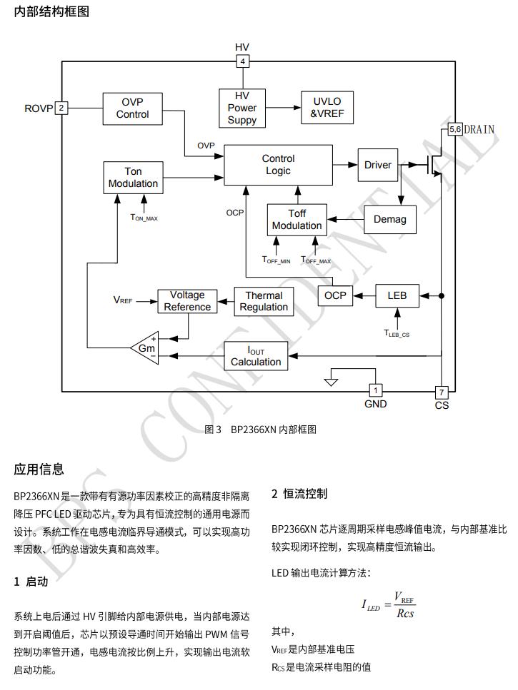 BP2366XN去除了VCC、COMP電容以此簡化外部電路。它 采用了特有的電流檢測技術,減少了外部元件的同時可實現 高精度輸出電流,且擁有良好的線性調整率和負載調整率。