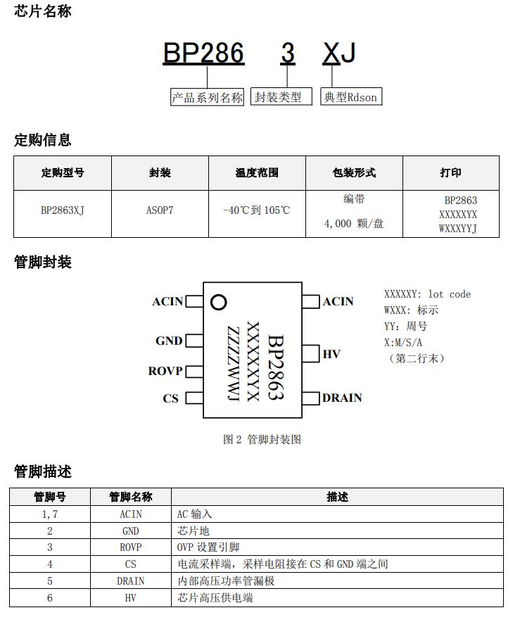 BP2863XJ 芯片采用內置高精度的電流采樣電路和  恒流控制技術,實現高精度的 LED 恒流輸出和優  異的線電壓調整率。芯片工作在電感電流臨界模  式,輸出電流不隨電感量和 LED 工作電壓的變化  而變化,實現優異的負載調整率。  BP2863XJ具有多重保護功能,包括LED短路保護,  芯片供電欠壓保護,外置 OVP,芯片溫度過熱調節  等。  BP2863XJ 采用 ASOP7 封裝。