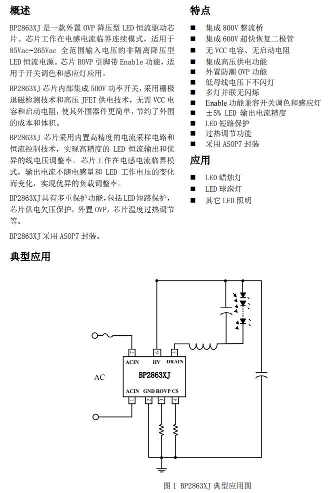 BP2863XJ 是一款外置 OVP 降壓型 LED 恒流驅動芯  片。芯片工作在電感電流臨界連續模式,適用于  85Vac~265Vac 全范圍輸入電壓的非隔離降壓型  LED 恒流電源。芯片 ROVP 引腳帶 Enable 功能,適  用于開關調色和感應燈應用。  BP2863XJ 芯片內部集成 500V 功率開關,采用柵極  退磁檢測技術和高壓 JFET 供電技術,無需 VCC 電  容和啟動電阻,使其外圍器件更簡單,節約了外圍  的成本和體積。