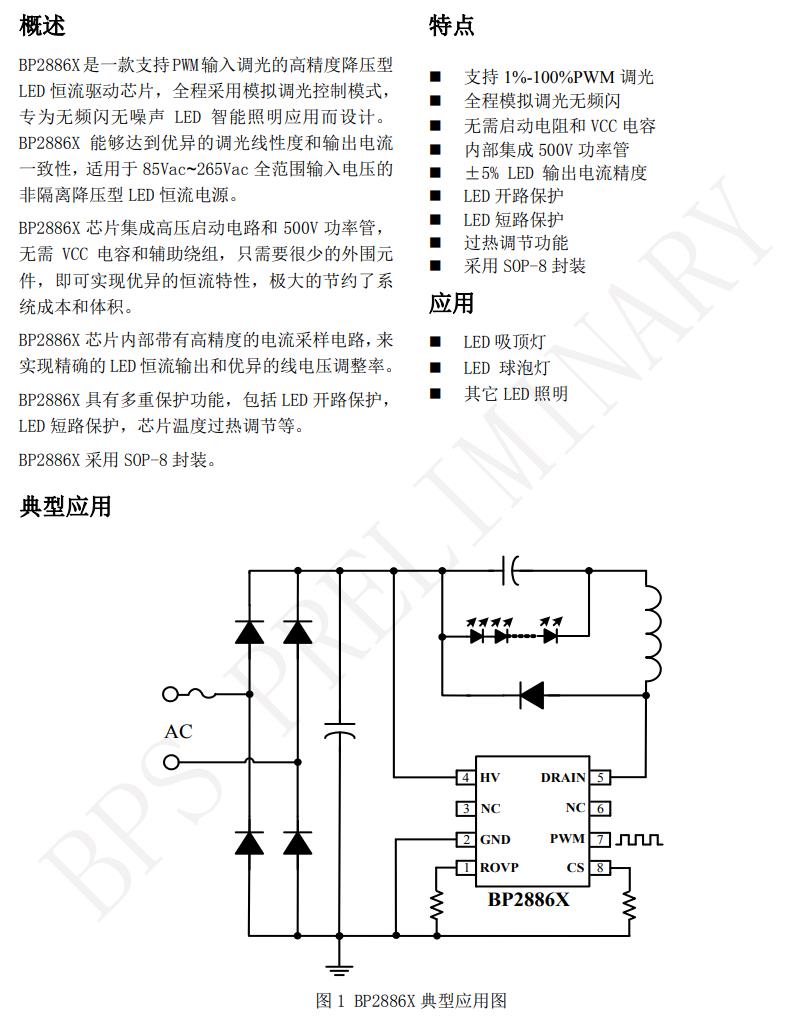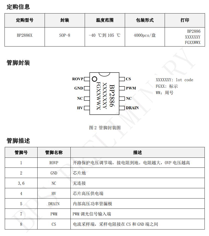 BP2886X 具有多重保護(hù)功能,包括 LED 開路保護(hù), LED 短路保護(hù),芯片溫度過熱調(diào)節(jié)等。 BP2886X 采用 SOP-8 封裝。