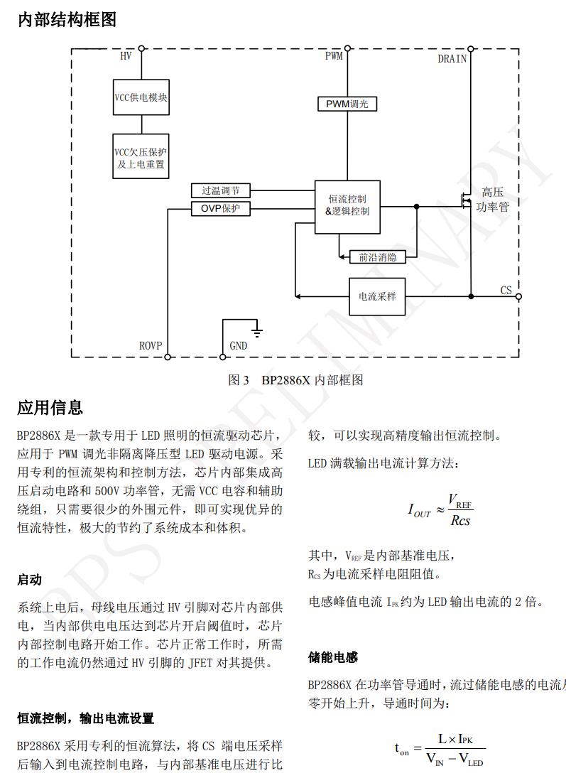 BP2886X 能夠達(dá)到優(yōu)異的調(diào)光線性度和輸出電流 一致性,適用于 85Vac~265Vac 全范圍輸入電壓的 非隔離降壓型 LED 恒流電源。 BP2886X 芯片集成高壓?jiǎn)?dòng)電路和 500V 功率管, 無需 VCC 電容和輔助繞組,只需要很少的外圍元 件,即可實(shí)現(xiàn)優(yōu)異的恒流特性,極大的節(jié)約了系 統(tǒng)成本和體積。 BP2886X 芯片內(nèi)部帶有高精度的電流采樣電路,來 實(shí)現(xiàn)精確的 LED 恒流輸出和優(yōu)異的線電壓調(diào)整率。