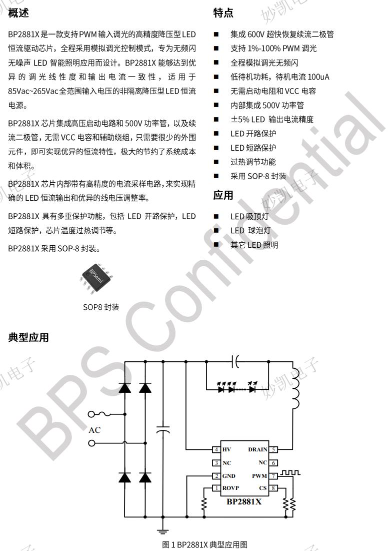 優勢 集成600V超快恢復續流二極管 支持1%-100%PWM 調光 全程模擬調光無頻閃 低待機功耗,待機電流100uA 無需啟動電阻和VCC電容 內部集成500V功率管 ±5%LED 輸出電流精度 LED開路保護 LED短路保護 過熱調節功能 采用SOP-8封裝