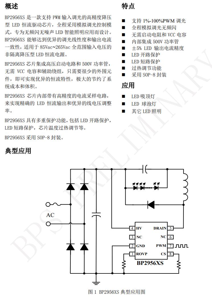 BP2956XS 是一款支持 PWM 輸入調光的高精度降壓  型 LED 恒流驅動芯片,全程采用模擬調光控制模  式,專為無頻閃無噪聲 LED 智能照明應用而設計。  BP2956XS 能夠達到優異的調光線性度和輸出電流  一致性,適用于 85Vac~265Vac 全范圍輸入電壓的  非隔離降壓型 LED 恒流電源。