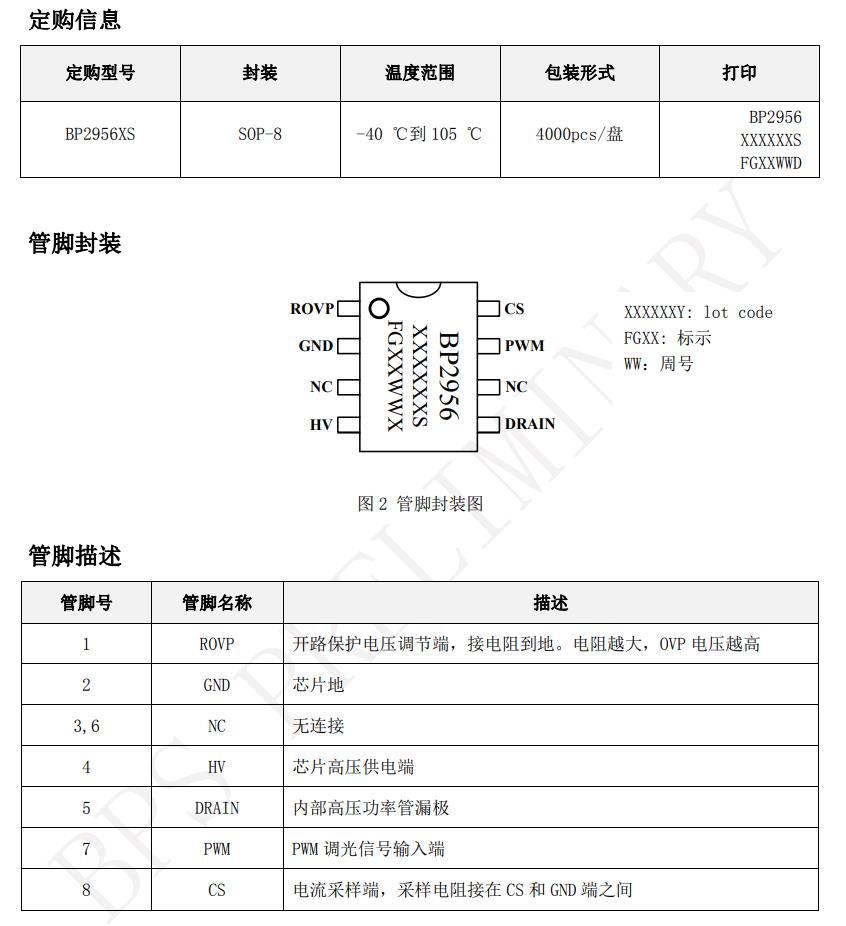 BP2956XS 具有多重保護功能,包括 LED 開路保護,  LED 短路保護,芯片溫度過熱調節等。  BP2956XS 采用 SOP-8 封裝。