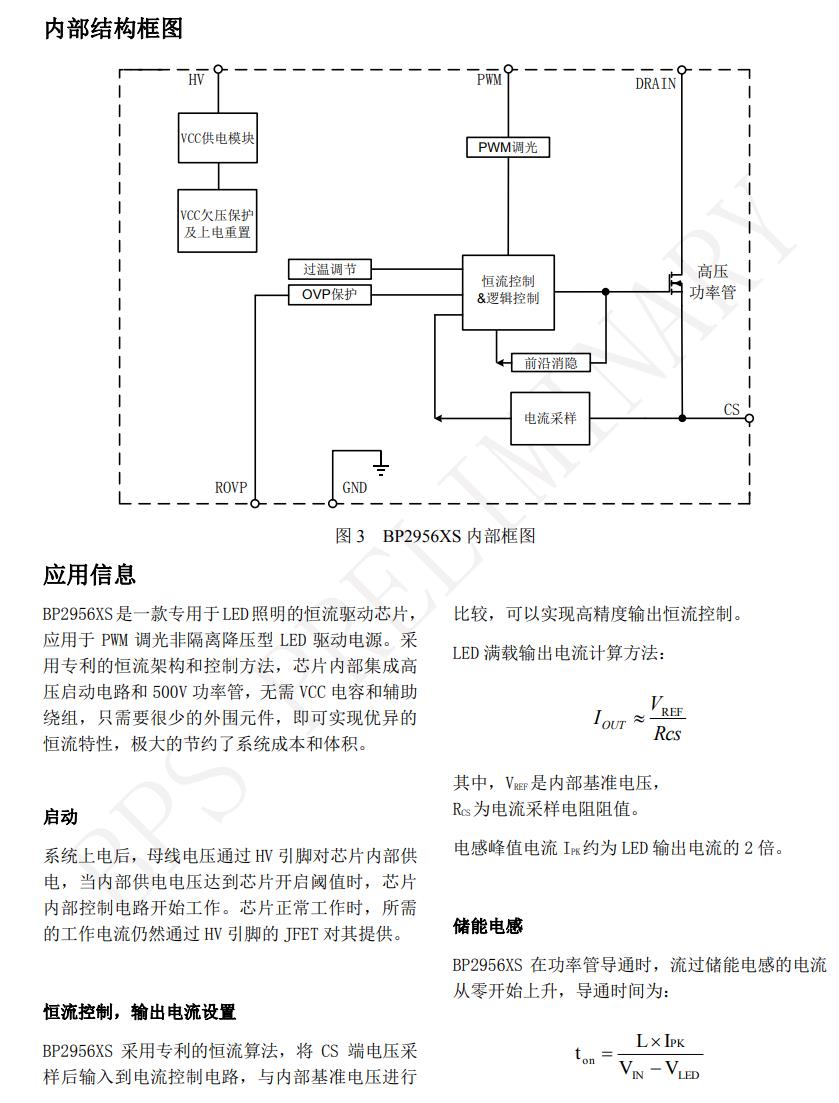 BP2956XS 芯片內部帶有高精度的電流采樣電路,  來實現精確的 LED 恒流輸出和優異的線電壓調整  率。
