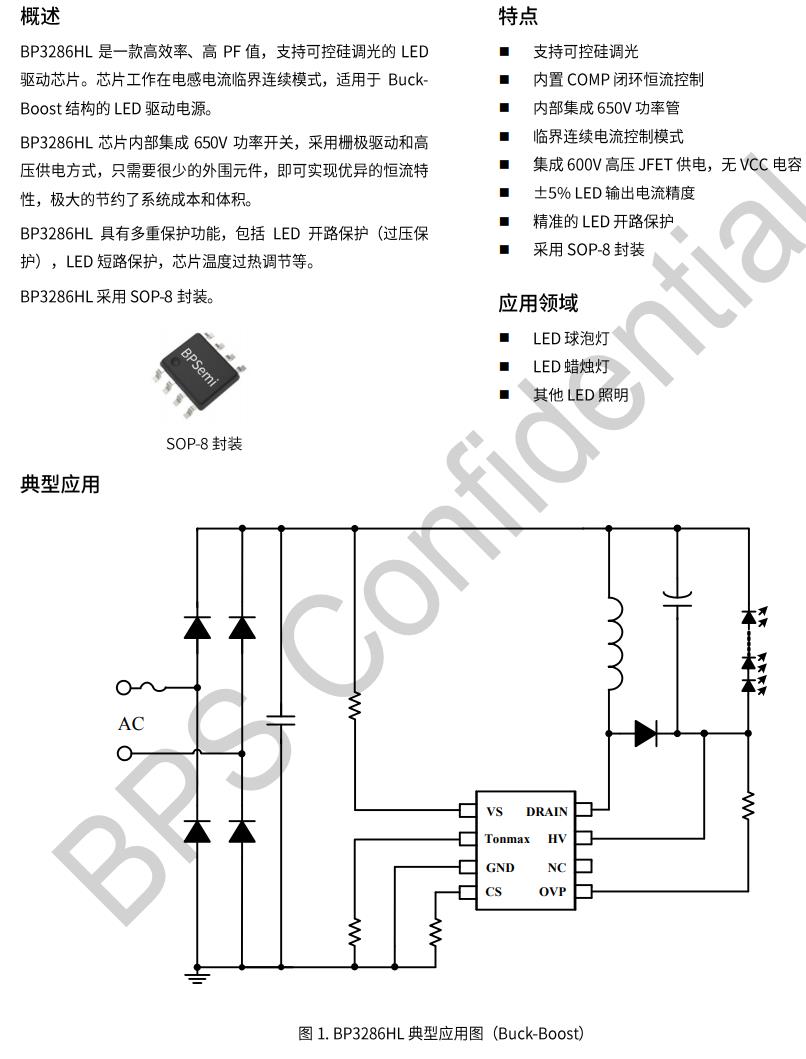 BP3286是一款高效率、高PF值,支持可控硅調光的LED 驅動芯片。芯片工作在電感電流臨界連續模式,適用于Buck-Boost結構的LED 驅動電源。