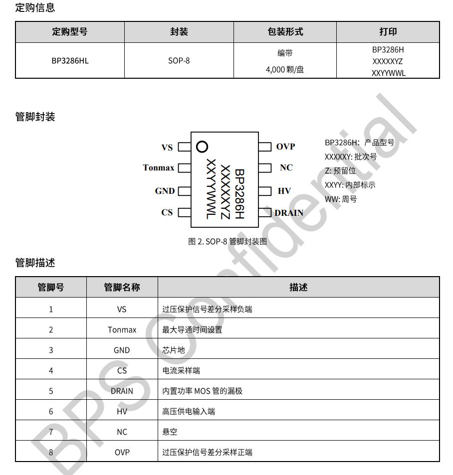 BP3286具有多重保護功能,包括 LED開路保護(過壓保護),LED短路保護,芯片溫度過熱調節等。BP3286采用SOP-8 封裝。
