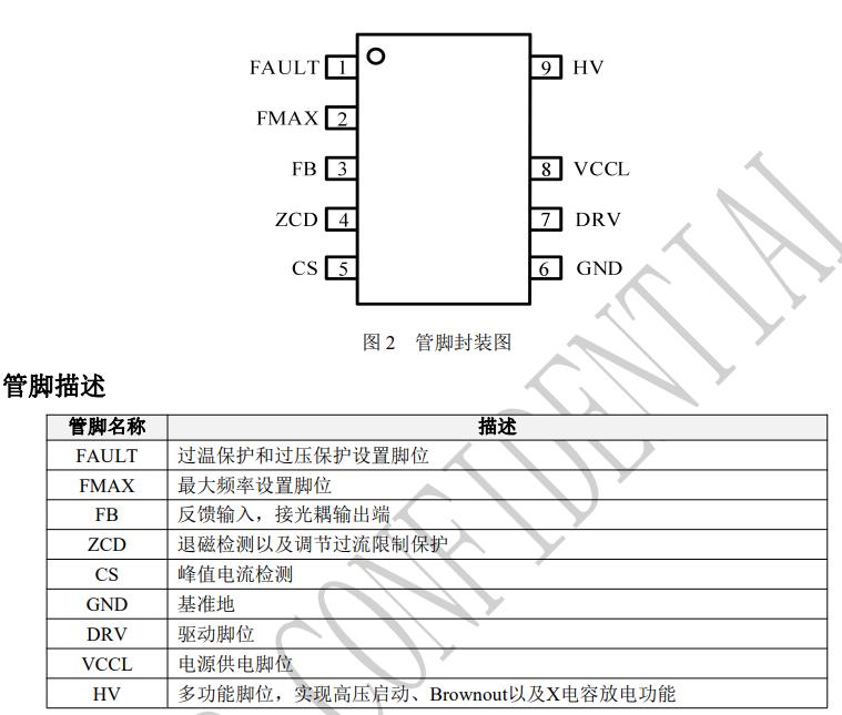 高頻QR反激控制 ? 內置高壓啟動電路 ? 內置X電容放電功能 ? 優異的EMI和音頻特性 ? 故障鎖死保護 ? CS異常過流保護 ? CS故障保護 ? 輸出過壓保護 ? VCC過壓保護 ? 故障不鎖死保護 ? HV腳Brownout保護 ? FAULT腳過溫保護 ? 內置過溫保護 ? 故障自恢復保護 ? 過流限制保護 應用 ? PD/快充 ? AC/DC適配器