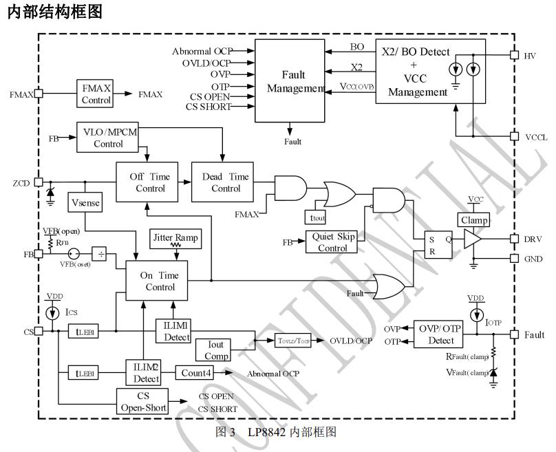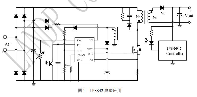 LP8842 是一款高性能高可靠性高頻 QR 反激控制器, 具有 HV 腳位高壓啟動功能,內置 X 電容放電功能。 針對 PD 應用,設計了過流限制保護以及降低最小 CS 功能。 LP8842 采用多模式恒壓控制方式:重載工作于 QR 模 式;隨著負載從重載到輕載逐漸減小,LP8842 會進入 谷底工作模式。在輕載時,為了進一步降低開關損耗, LP8842 會進入 MPCM 模式,會加大峰值電流,進一 步減小開關頻率。在更輕載或空載時,LP8842 工作 于打嗝模式。 LP8842 具有多重保護功能,包括 CS 異常過流保護, CS 故障保護,輸出過壓保護,VCC 過壓保護,HV 腳 Brownout 保護,FAULT 腳過溫保護,內置過溫 保護,過流限制保護等功能。