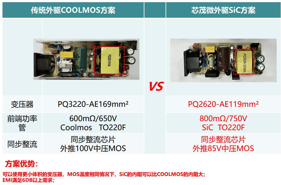 可以使用更小體積的變壓器,MOS溫度相同情況下,SiC的內阻可以比COOLMOS的內阻大; EMI滿足6DB以上需求;