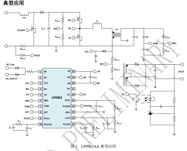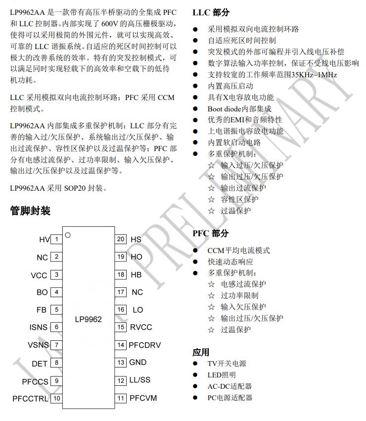 LP9962AA 是一款帶有高壓半橋驅(qū)動(dòng)的全集成 PFC 和 LLC 控制器。內(nèi)部實(shí)現(xiàn)了 600V 的高壓柵極驅(qū)動(dòng), 使得可以采用極簡(jiǎn)的外圍元件,就可以實(shí)現(xiàn)高效、 可靠的 LLC 諧振系統(tǒng)。自適應(yīng)的死區(qū)時(shí)間控制可以 極大的改善系統(tǒng)的效率。特有的突發(fā)控制模式,可 以滿足同時(shí)實(shí)現(xiàn)輕載下的高效率和空載下的低待 機(jī)功耗。 LLC 采用模擬雙向電流控制環(huán)路;PFC 采用 CCM 控制模式。