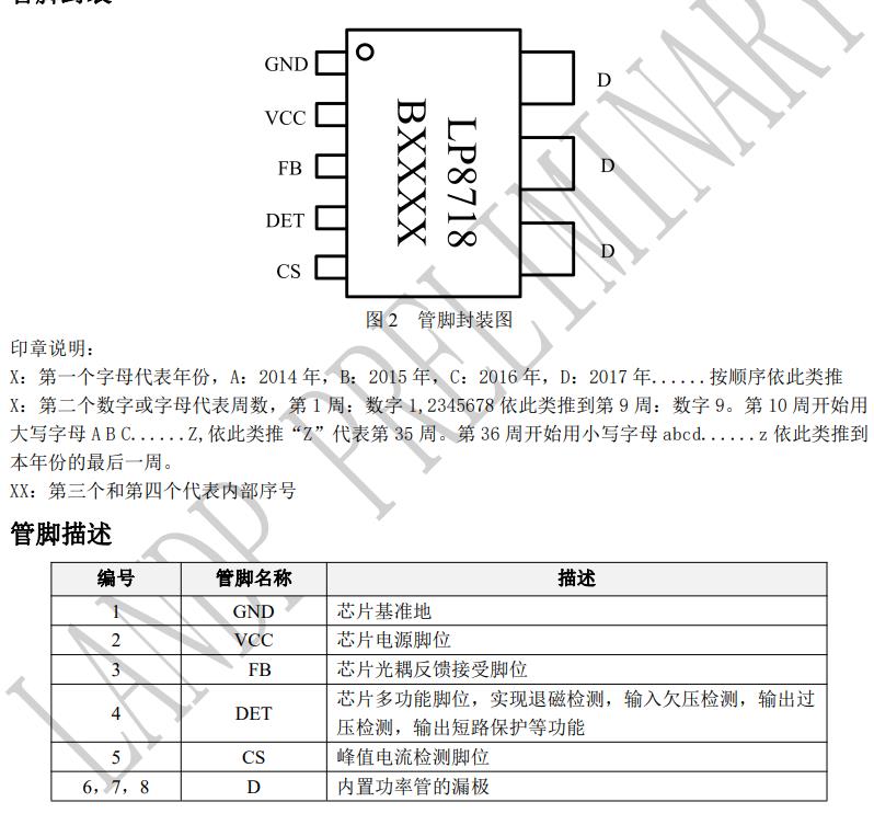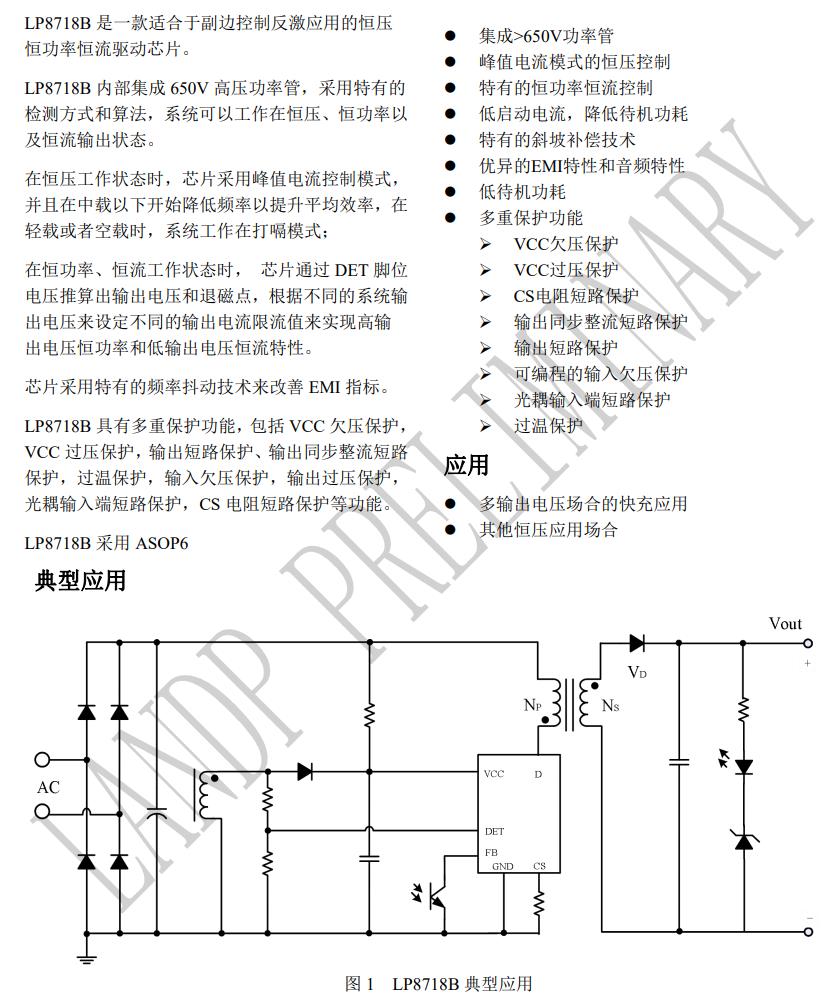 LP8718B 是一款適合于副邊控制反激應(yīng)用的恒壓 恒功率恒流驅(qū)動(dòng)芯片。 LP8718B 內(nèi)部集成 650V 高壓功率管,采用特有的 檢測(cè)方式和算法,系統(tǒng)可以工作在恒壓、恒功率以 及恒流輸出狀態(tài)。 在恒壓工作狀態(tài)時(shí),芯片采用峰值電流控制模式, 并且在中載以下開始降低頻率以提升平均效率,在 輕載或者空載時(shí),系統(tǒng)工作在打嗝模式; 在恒功率、恒流工作狀態(tài)時(shí), 芯片通過 DET 腳位 電壓推算出輸出電壓和退磁點(diǎn),根據(jù)不同的系統(tǒng)輸 出電壓來設(shè)定不同的輸出電流限流值來實(shí)現(xiàn)高輸 出電壓恒功率和低輸出電壓恒流特性。 芯片采用特有的頻率抖動(dòng)技術(shù)來改善 EMI 指標(biāo)。