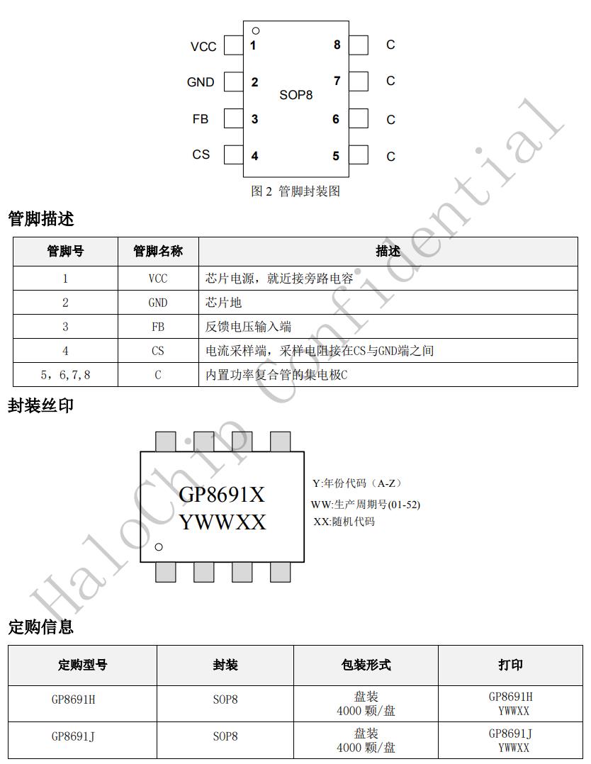 GP8691X可以實(shí)現(xiàn)良好的恒壓、恒流特性,滿足待機(jī)功耗小于75mW。GP8691X具有多重保護(hù)功能,包括開路保護(hù),過壓保護(hù),短路保護(hù)等功能。GP8691X采用SOP8封裝