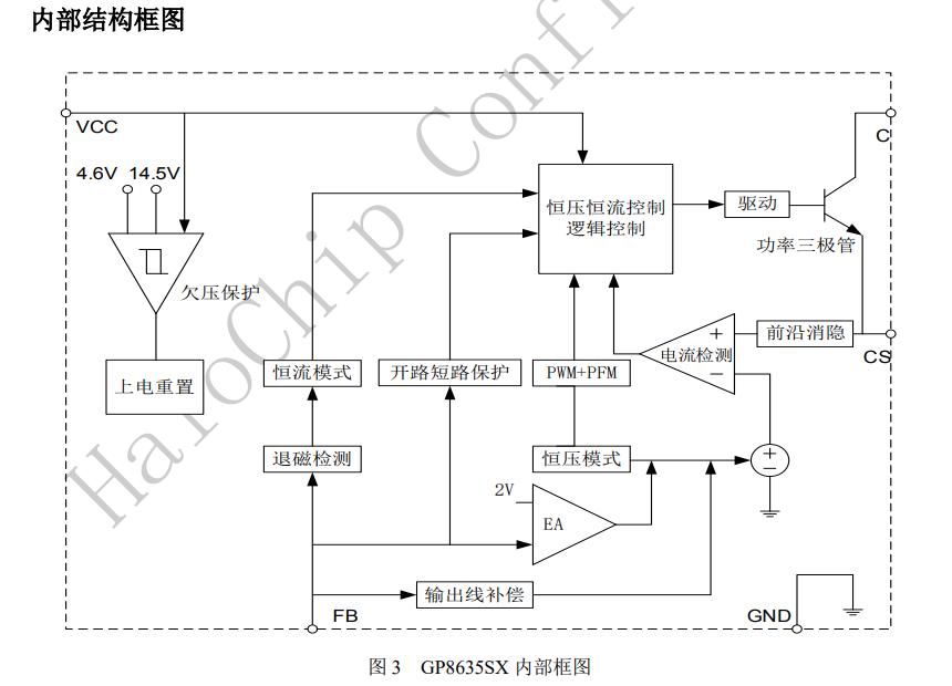 GP8635SX內置環路補償電路,無需外圍補償電路,系統具有良好的穩定性。GP8635SX可以實現良好的恒壓、恒流特性,滿足待機功耗小于75mW。