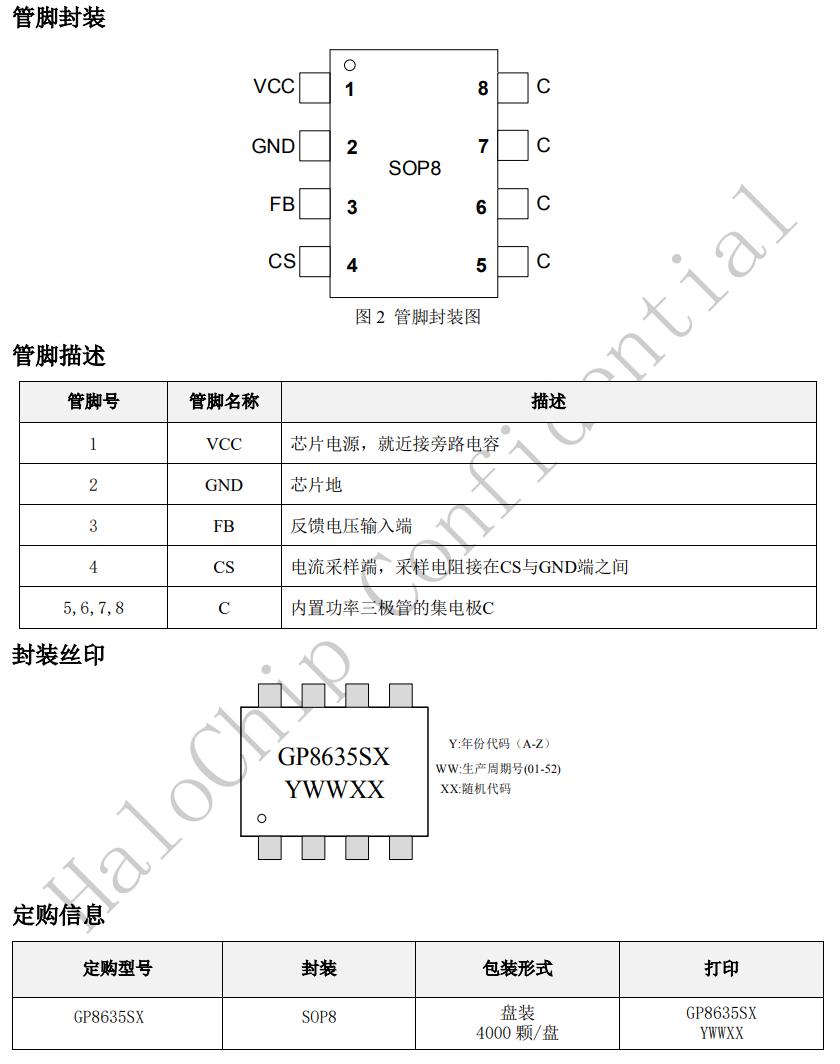 GP8635SX具有多重保護功能,包括開路保護,過壓保護,短路保護等功能。GP8635SX采用SOP8封裝