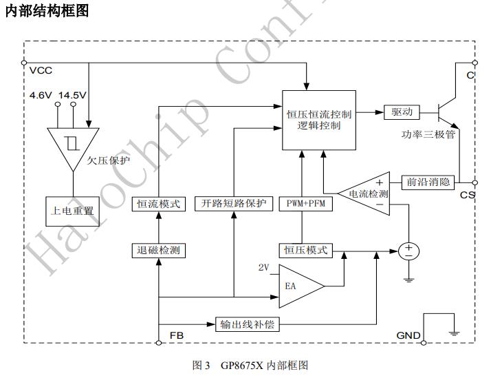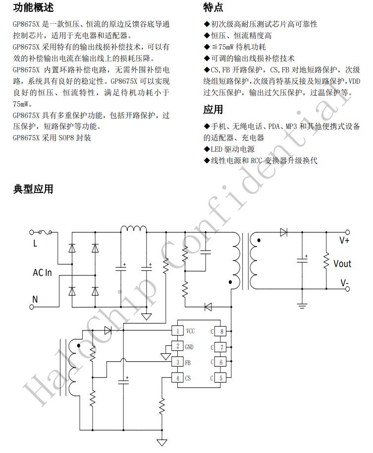 GP8675X內置環路補償電路,無需外圍補償電路,系統具有良好的穩定性。GP8675X可以實現良好的恒壓、恒流特性,滿足待機功耗小于75mW。