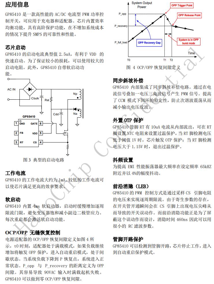 GP85410具有OCP/OPP無縫芯片具有OCP補償噪音消除技術,輸入電壓90VAC時重載無噪音。GP85410具有多種功能和保護,諸如UVLO,VDDOVP,逐周期電流限制OCP,管腳開路保護,OLP,RT腳短路保護等。