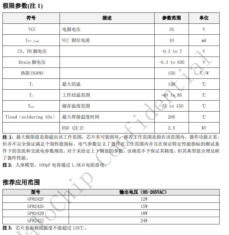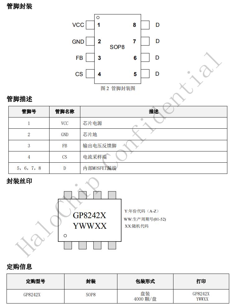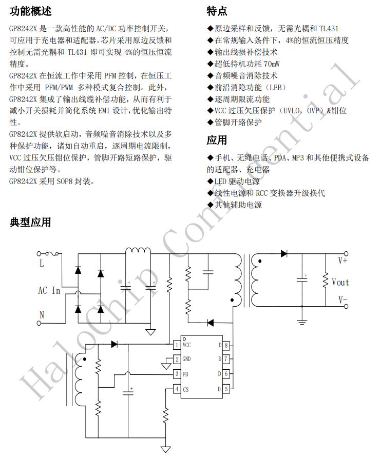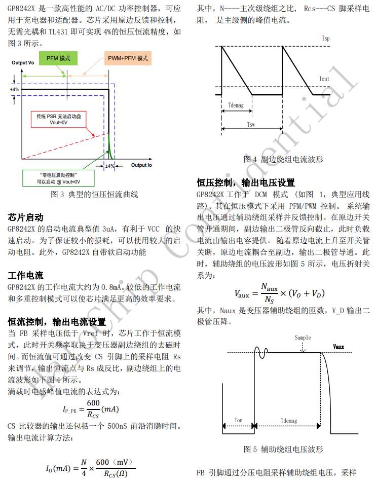 GP8242X是一款高性能的AC/DC功率控制開關,可應用于充電器和適配器。芯片采用原邊反饋和控制無需光耦和TL431即可實現4%的恒壓恒流精度。GP8242X在恒流工作中采用PFM控制,在恒壓工作中采用PFM/PWM多種模式復合控制。此外,GP8242X集成了輸出線纜補償功能,從而有利于減小開關損耗并簡化系統EMI設計,優(yōu)化輸出特性。GP8242X提供軟啟動,音頻噪音消除技術以及多種保護功能,諸如自動重啟,逐周期電流限制,VCC過壓欠壓鉗位保護,管腳開路短路保護,驅動鉗位保護等。GP8242X采用SOP8封裝。