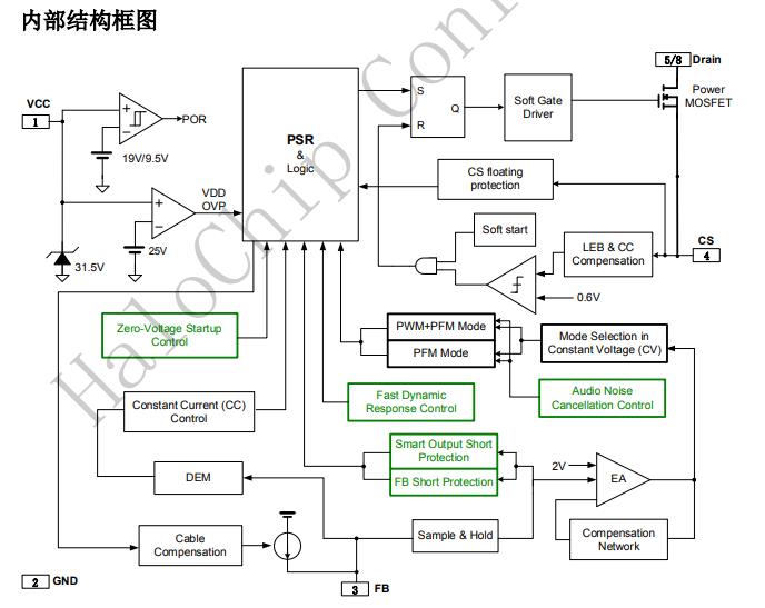 原邊采樣和反饋,無需光耦和TL431在常規(guī)輸入條件下,4%的恒流恒壓精度輸出線損補償技術超低待機功耗70mW音頻噪音消除技術前沿消隱功能(LEB)逐周期限流功能VCC過壓欠壓保護(UVLO,OVP)&鉗位管腳開路保護
