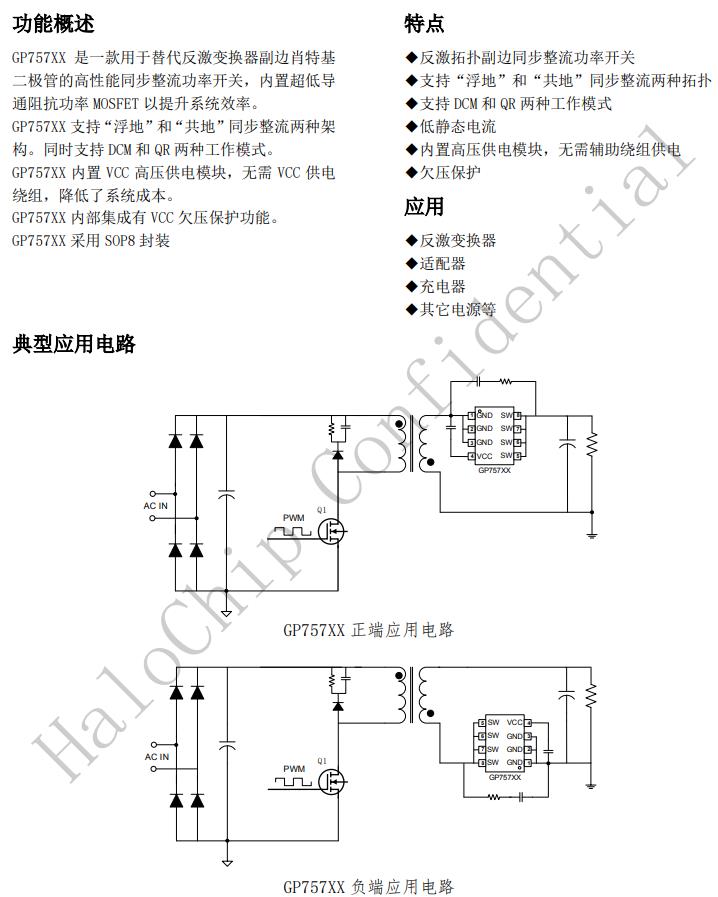 GP757XX是一款用于替代反激變換器副邊肖特基二極管的高性能同步整流功率開關(guān),內(nèi)置超低導(dǎo)通阻抗功率MOSFET以提升系統(tǒng)效率。