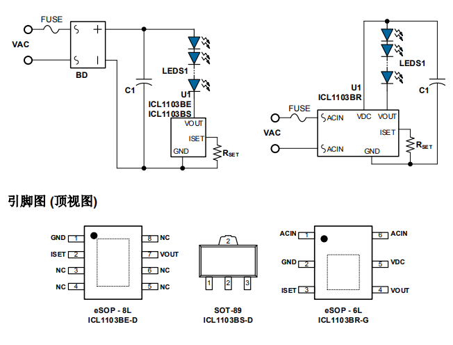 | ICL1103 | AC-DC | 110V/220V | 60mA | SOT89/ESOP8/HSOP-7 | 550V高壓性線恒流IC |