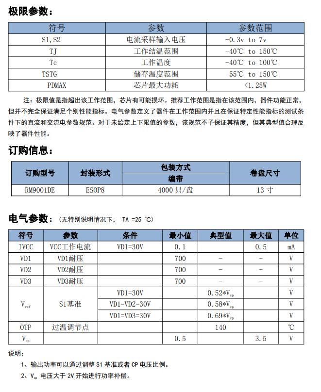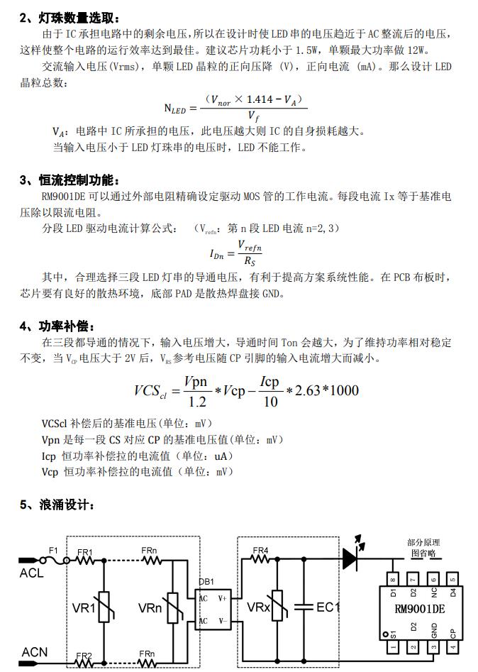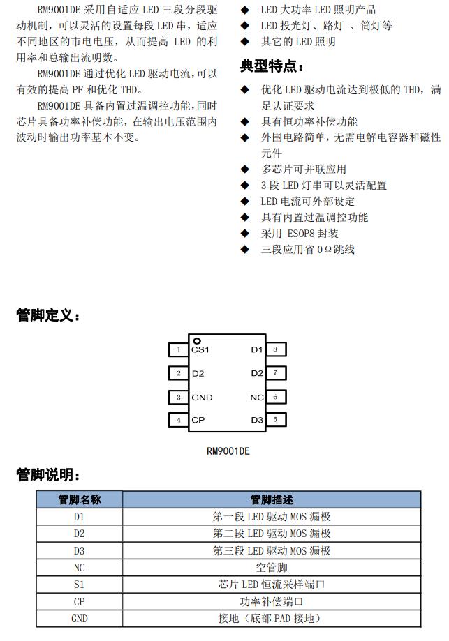 RM9001DE 通過優(yōu)化 LED 驅(qū)動電流,可以 有效的提高 PF 和優(yōu)化 THD。 RM9001DE 具備內(nèi)置過溫調(diào)控功能,同時 芯片具備功率補償功能,在輸出電壓范圍內(nèi) 波動時輸出功率基本不變。