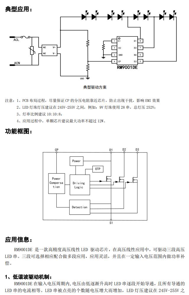 RM9001DE 采用自適應 LED 三段分段驅(qū) 動機制,可以靈活的設置每段 LED 串,適應 不同地區(qū)的市電電壓,從而提高 LED 的利 用率和總輸出流明數(shù)。