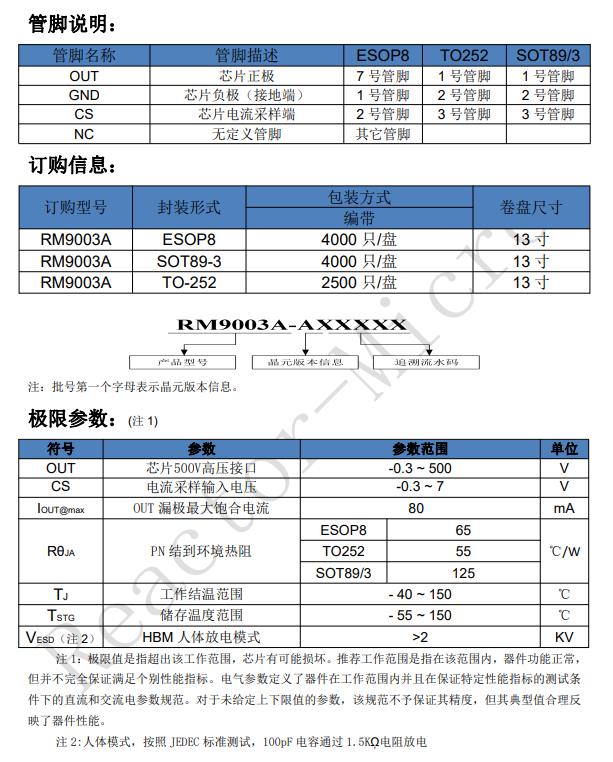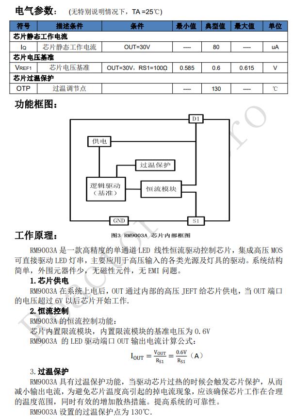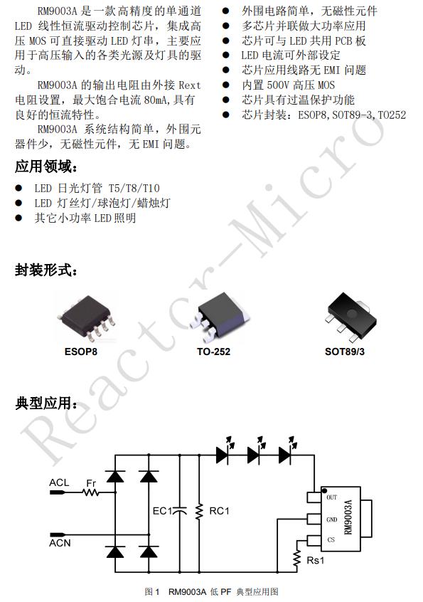 RM9003A 是一款高精度的單通道 LED 線性恒流驅動控制芯片,集成高 壓 MOS 可直接驅動 LED 燈串,主要應 用于高壓輸入的各類光源及燈具的驅 動。 RM9003A 系統結構簡單,外圍元 器件少,無磁性元件,無 EMI 問題。